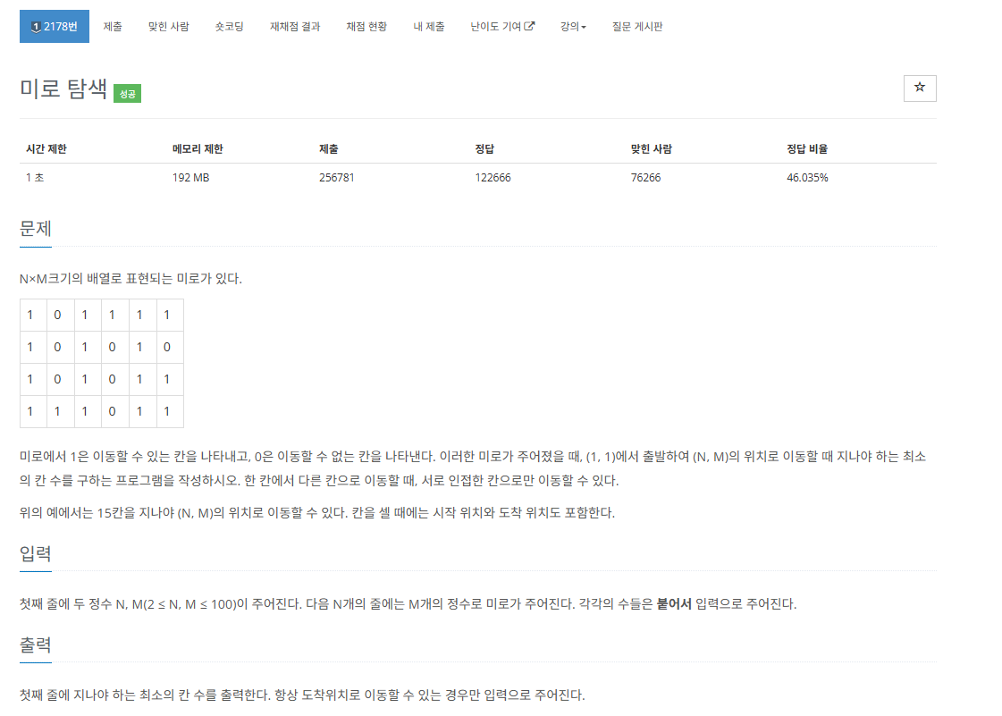문제를 그래프로 생각해보자. 미로의 각 칸을 정점으로 보고, 상/하/좌/우로 이동 가능한 칸 끼리는 간선으로 연결된 그래프라고 생각했을 때 최단 이동 횟수는 간선 가중치가 전부 1인 그래프 최단거리임을 알 수 있다. 이를 통해 이 문제는 BFS로 해결하면 되겠구나! 하는 아이디어를 떠올리면된다. 사실 BFS로 풀면되겠다는 아이디어만 떠올리면 BFS의 전형적인 그 코드 흐름을 따라 구현하기만 하면되기때문에 BFS 문제중에서 난이도가 낮은편인 문제라 생각한다. (그렇다고 막 쉽진 않지만...)
